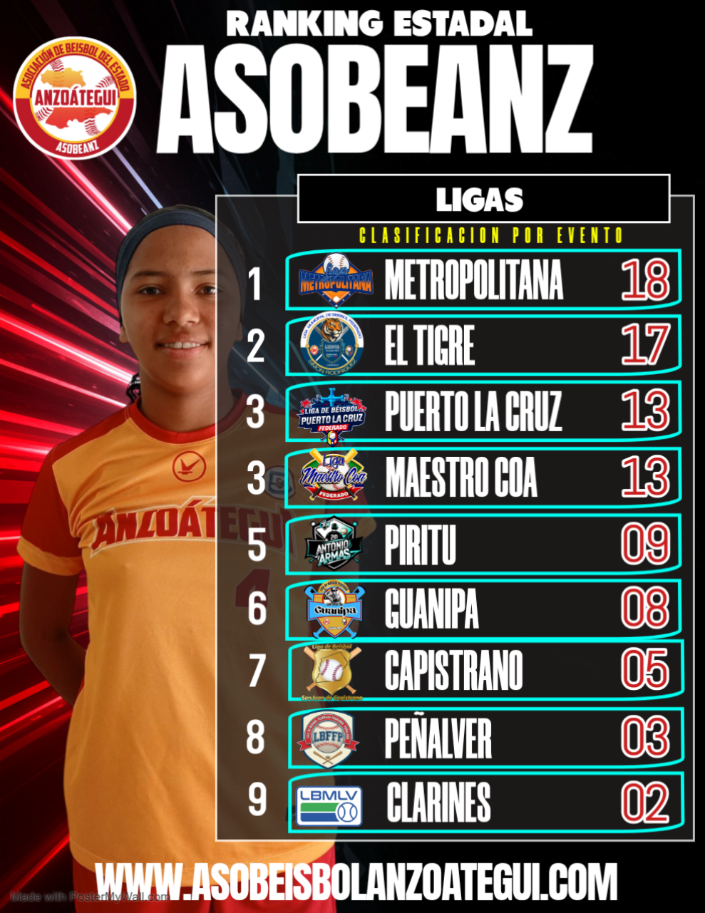 BARCELONA, ANZOÁTEGUI – La Asociación de Béisbol del Estado Anzoátegui (ASOBEANZ) ha hecho pública la actualización de su Ranking Estadal de Ligas 2026, reflejando la intensa actividad y el alto nivel competitivo que caracteriza al béisbol menor en la entidad.